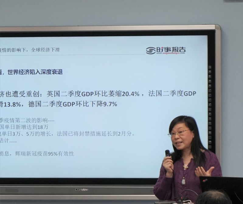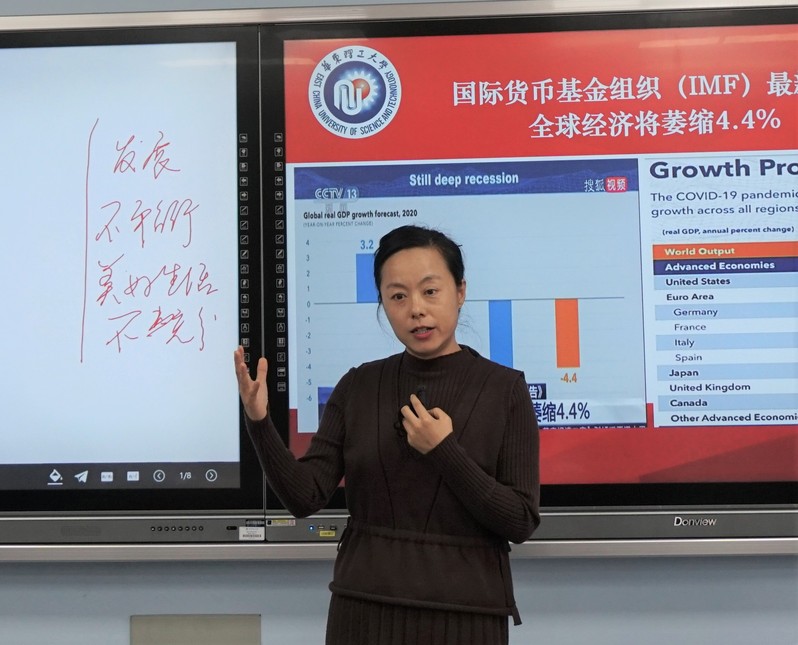 我院吴青芳、王党辉、曾晓玲与张璐倩四位教师参加比赛。在比赛过程中,吴青芳以视频导入,阐释了“全面辩证长远看待我国经济发展”的问题;王党辉围绕“人是什么”,讲解了古今中外对该问题看法,引出马克思对人的本质的回答;曾晓玲从各国在疫情下的经济发展状况入手,讲述了“新冠疫情影响下中国政府的应对”问题;张璐倩以“实践与认识及其辩证关系”为题,带来了生动的一课。