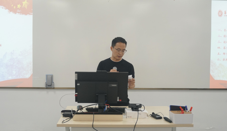 第三议程,汪斌锋积极动员全体教师参与学院各项活动。汪斌锋向与会人员介绍了落实党委要求全体师生共同拍摄100集党建小视频的具体方案,同与会人员积极探索党史宣传新形式。随后,他宣布马院传统活动师生青年校友趣味健康运动会即将来临,希望教师们踊跃报名,与学院学生加强互动,传承马院“家文化”。
