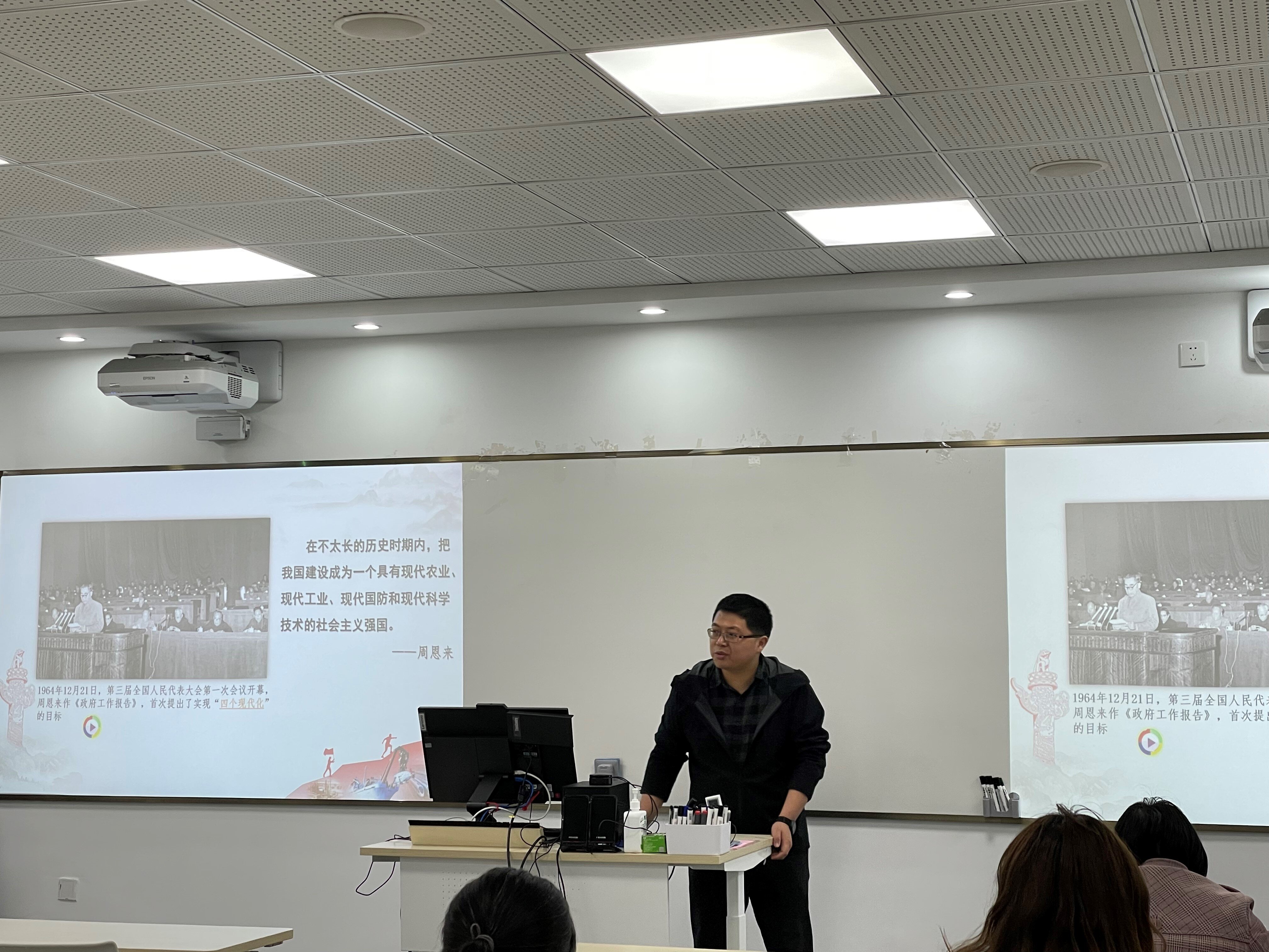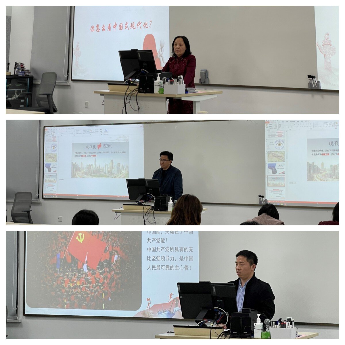 吴青芳、王阳、杨少明三位老师围绕“走好中国式现代化之路”主题分享备课内容。吴青芳就本讲第一节“接续奋斗,追求千年梦想”开展详细讲解,从中国式现代化之路的历程、特征、本质要求以及与西方式现代化的比较等方面阐明了中国式现代化的深刻内涵。王阳围绕本讲第二节“立足国情,开辟全新道路”,紧密结合两会等时政热点,从“人口规模巨大的现代化、全体人民共同富裕的现代化、物质文明和精神文明相协调的现代化、人与自然和谐共生的现代化、走和平发展道路的现代化”5个方面对中国式现代化进行了详细讲解。杨少明围绕本讲第三节“凝心聚力,推进复兴伟业”,结合自身工作经历,让学生理解每一个人都是中国式现代化的受益者、见证者,引导学生踔厉奋发,不负韶华,用自己的青春力量书写中国式现代化之路的新高度、新篇章。