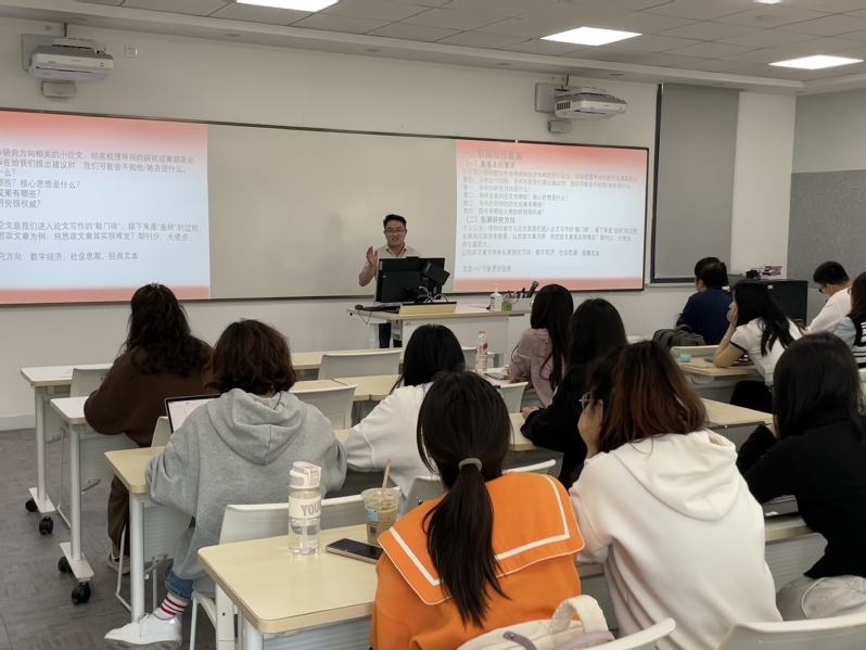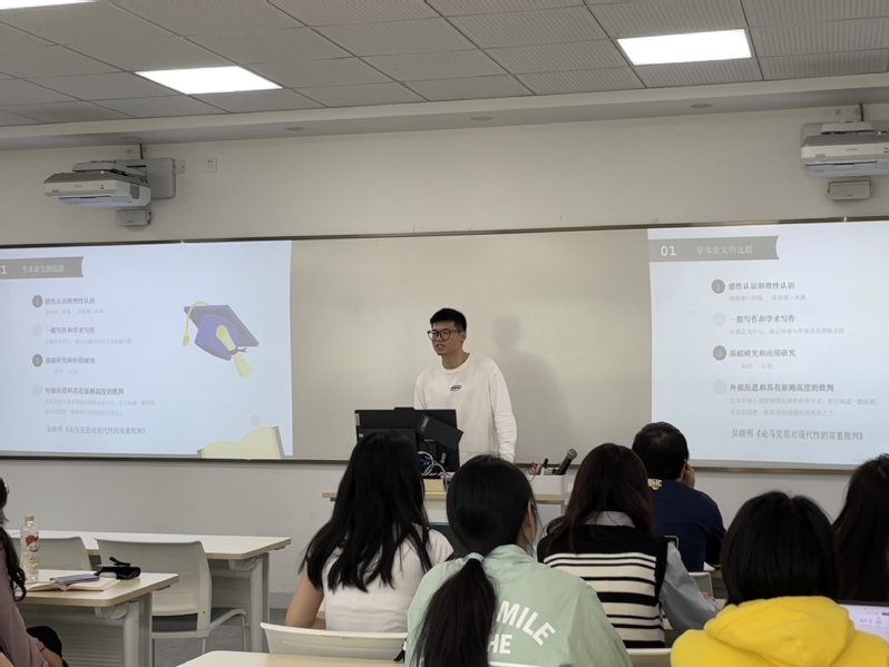 高海波结合自身科研经历,从“前期写作奠基”“确定论文选题”“论文写作展开”“论文修改过程”“论文投稿过程”五个方面展开了论文写作经验的主题分享。高海波分享了自己在304永利集团马院的学习经历,指出要善于结合导师研究方向开展科研,同时在写作前要进行大量阅读,以保证和提升论文质量。