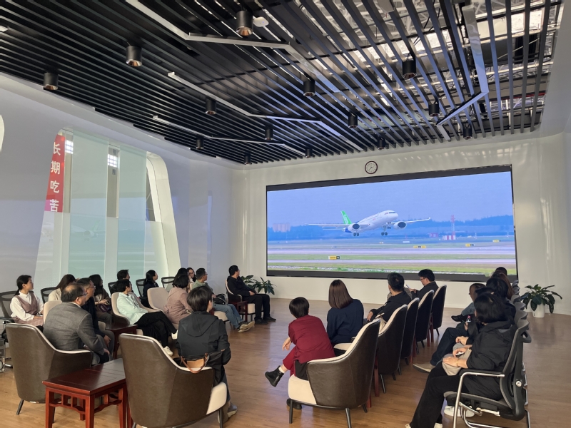 参观过程中,通过观看宣传短片,老师们对中国商飞的发展历程、主营业务、特色优势和未来规划等有了初步了解。在工作人员的陪同讲解下,老师们进一步感受到了我国民机产业从蹒跚起步到振翅欲飞的跨越,从国产喷气客机零的突破到C919大型客机横空出世、投入商业运营的艰辛历程。老师们怀着满腔的自豪登上ARJ21支线客机、C919大型客机、C929远程宽体客机的展示样机进行参观试坐,近距离感受大国重器的魅力。