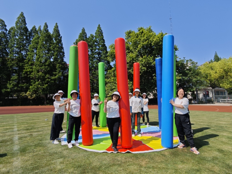 在这个项目中,要求十位老师分别双手抱着一根充气杆,在保证充气杆不倒的情况下,顺时针方向换位,是一项考验协调能力和合作精神的活动。老师们配合默契,在统一的口号中有条不絮地换位置,将团结一致、无畏挑战的精神贯彻到底。