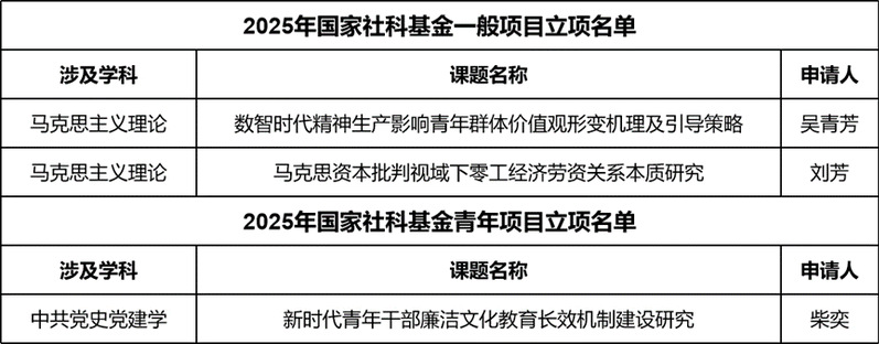 9月5日,全国哲学社会科学工作办公室发布了2025年国家社会科学基金年度项目立项名单公示,我院3项课题入选,其中一般项目2项,青年项目1项。吴青芳老师申报的“数智时代精神生产影响青年群体价值观形变机理及引导策略”和刘芳老师申报的“马克思资本批判视域下零工经济劳资关系本质研究”拟获一般项目立项,柴奕老师申报的“新时代青年干部廉洁文化教育长效机制建设研究”拟获青年项目立项。