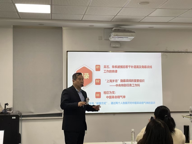 讲座伊始,贺东航教授以热播谍战剧《沉默的荣耀》为切入点,深度解读吴石将军等我党隐蔽战线英烈的感人事迹,并围绕吴石将军与周恩来总理两个人物展开对中国革命精气神的宣讲。讲座中,贺东教授还原了吴石将军在狱中遭受酷刑却坚守信仰、牵挂家人仍矢志不渝的悲壮历程;结合周恩来总理的人生轨迹,详细讲述了他作为中国共产党隐蔽战线的统帅,开辟秘密红色交通网和领导中央特科的峥嵘岁月,回望周总理在弥留之际仍牵挂祖国、心系人民、惦念隐蔽战线战友,鞠躬尽瘁、一生以赤诚昭示初心的伟岸情怀。此次讲座是一堂兼具历史厚度与情感温度的党性教育课,不少师生被英烈的感人事迹和革命精神深深感染,热泪盈眶。